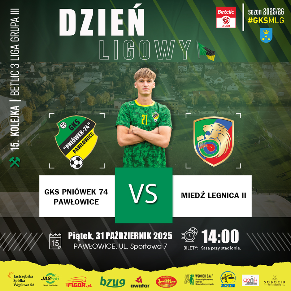 W 15. kolejce Betclic 3 Ligi GKS Pniówek 74 Pawłowice podejmie na własnym stadionie rezerwy Miedzi Legnica wyjątkowo 31 października o godz. 14:00 na ul. Sportowej.