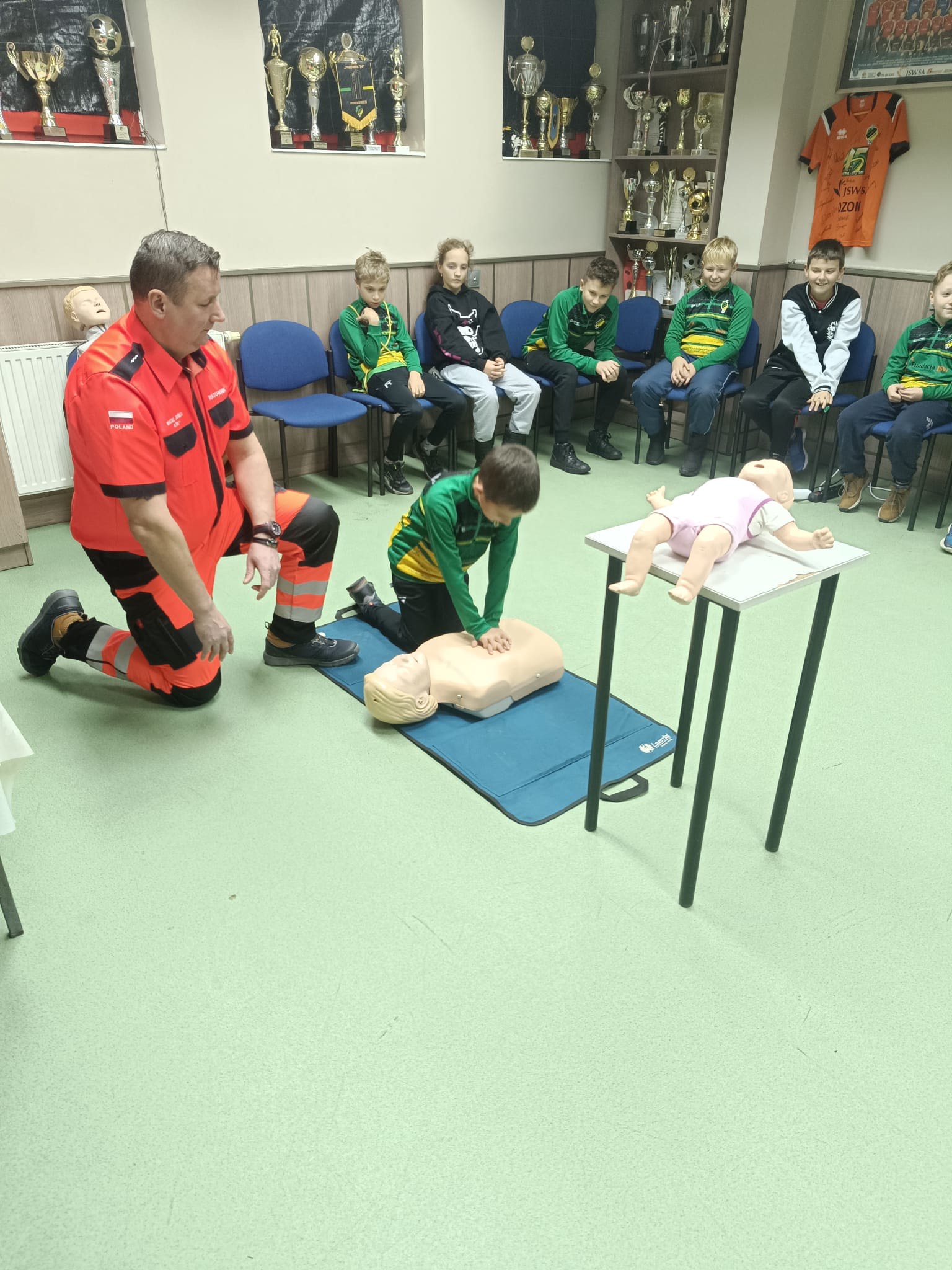 Podczas szkolenia zawodnicy mieli okazję przećwiczyć resuscytację krążeniowo-oddechową (RKO) na profesjonalnych fantomach medycznych – zarówno osoby dorosłej, jak i niemowlęcia.