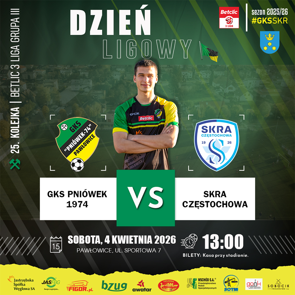 Już w najbliższej 25. kolejce Betclic III Ligi (grupa 3) zespół GKS Pniówek 74 Pawłowice zmierzy się na własnym stadionie ze Skra Częstochowa. Spotkanie zapowiada się niezwykle ciekawie, ponieważ rywale zajmują obecnie wysokie, 6. miejsce w tabeli z dorobkiem 41 punktów i traci jedne 6 punktów do lidera naszej grupy – Lechia Zielona Góra. To spotkanie rozegramy u siebie 4 kwietnia w Wielką Sobotę o godz. 13:00!